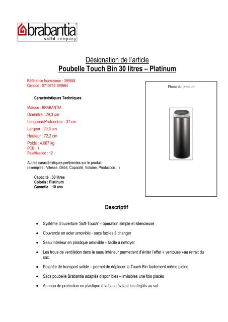 Poubelle Brabantia Touch 30 L Touch Darty