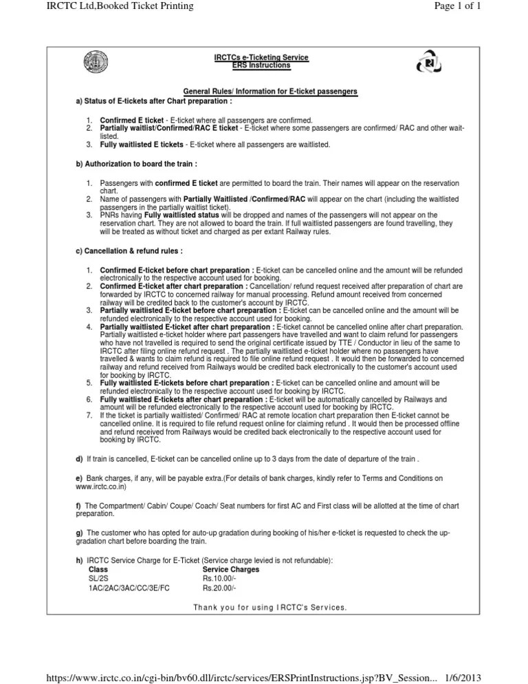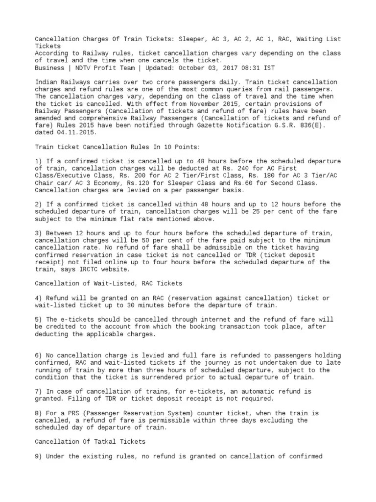 Railway Ticket Cancellation Charges For Waiting List E Ticket